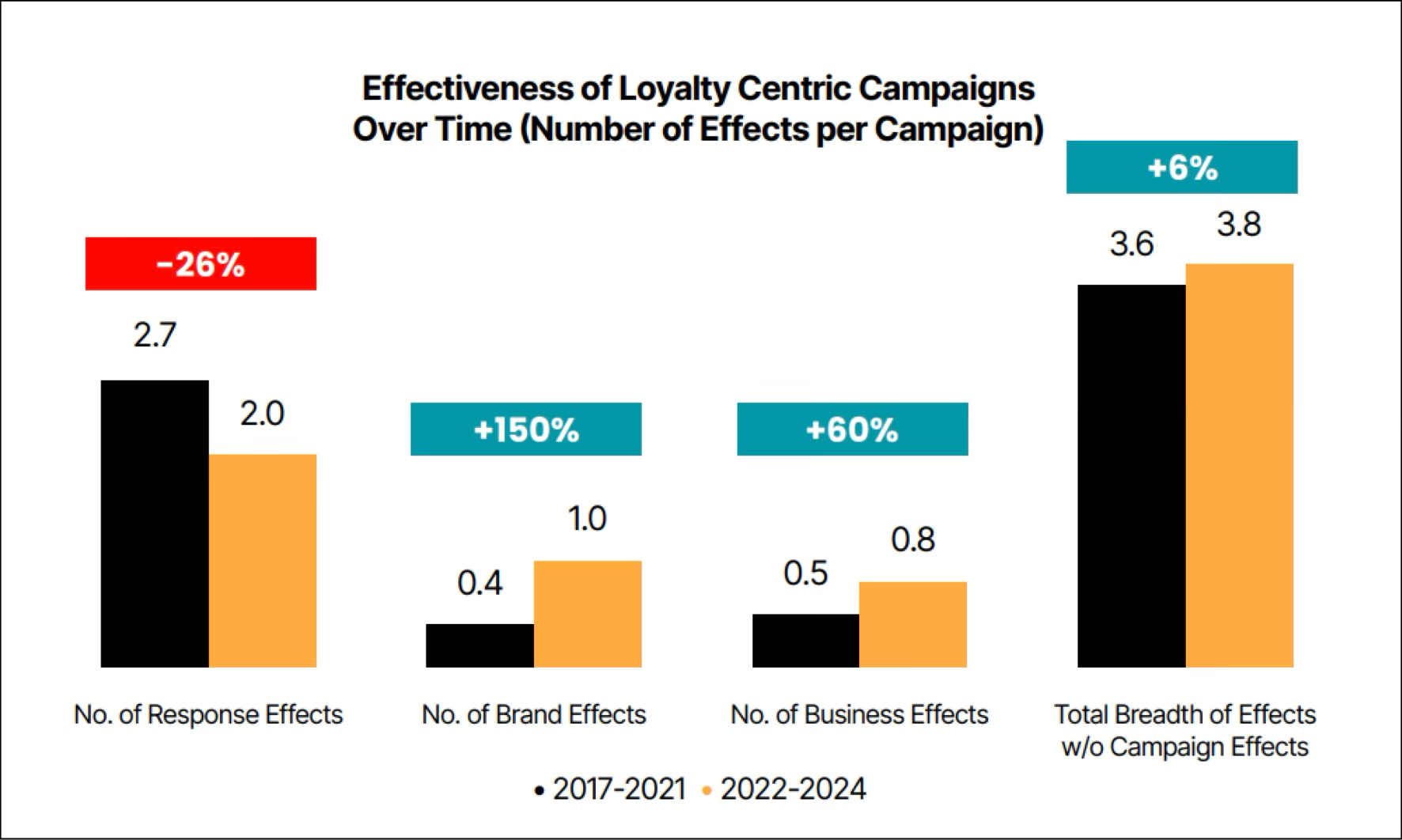 In the post-Covid era of 2022 to 2024, the number of brand effects per loyalty-centric campaign grew by 150%, while the number of response effects declined by 26%. The impact of loyalty is pivoting from one of short-term marketing outcomes, to longer brand-lead outcomes. At the same time, Business Effects have grown by 60%.