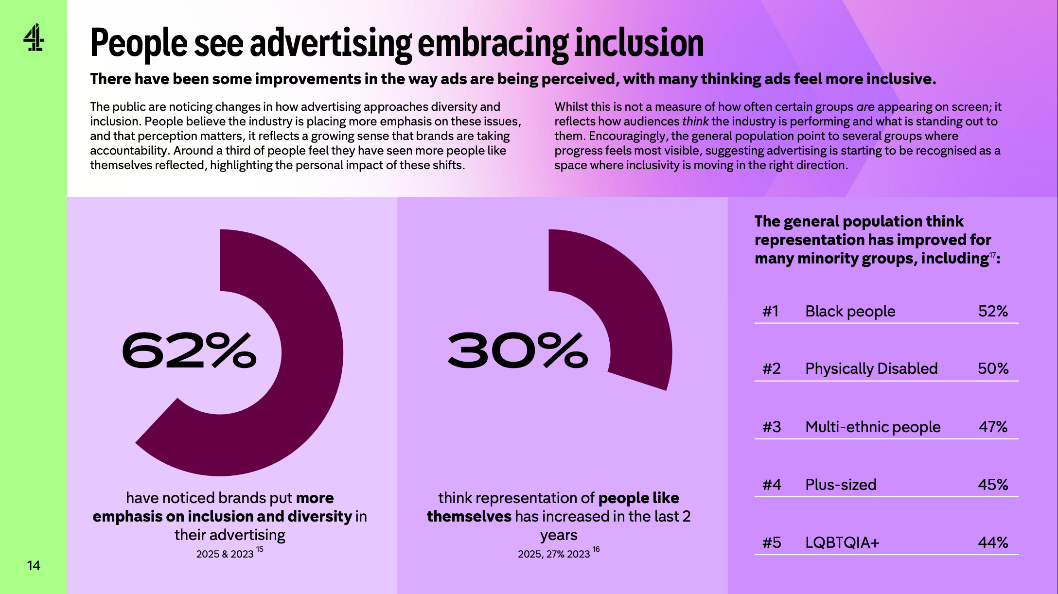 Channel 4’s research reveals pregnant women appear in just 0.1% of all UK adverts, only 2% of ads feature LGBTQIA+ people which is below the 3.2% of LGBTQIA+ people living in the UK population at the time of the 2021 Census, and only 4% of ads feature disabled people vs. 17.8% in the UK population (Census 2021), unchanged from the average representation of the last six years.