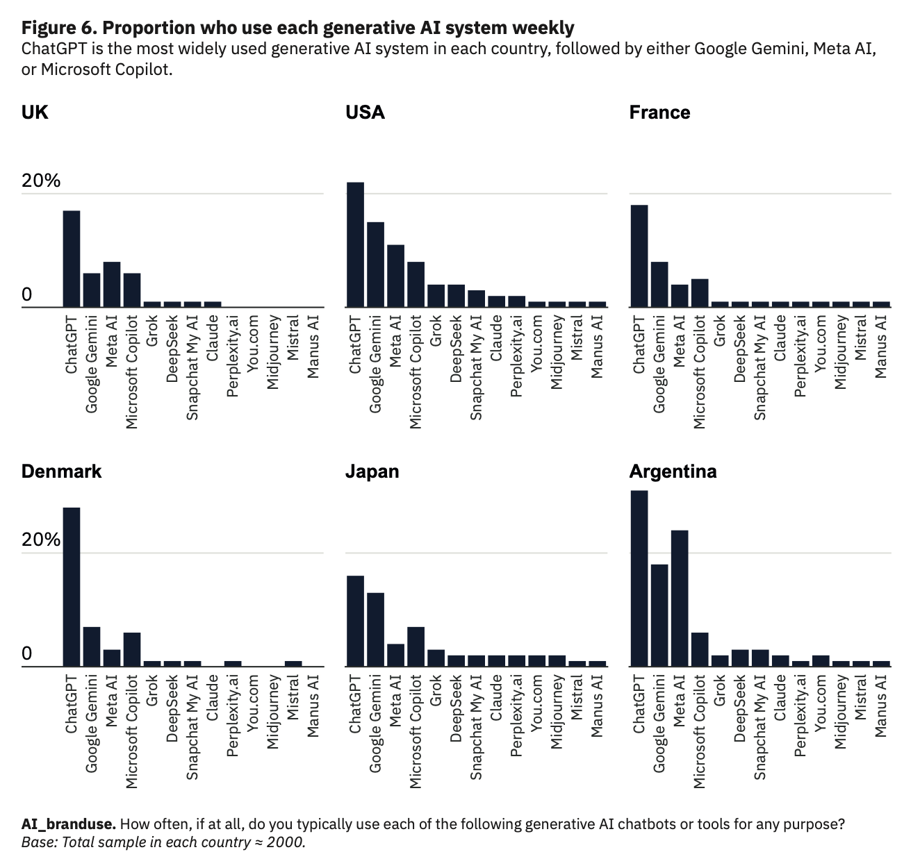 On average across six countries, just under one third (29%) say that they trust ChatGPT, ahead of Google Gemini (18%), Microsoft Copilot (12%), and Meta (12%) (Figure 14, see next page). Less than one in ten say they trust all of the other generative AI systems we asked about. Again, this is primarily because only around 15% or fewer have actually heard of them, meaning that the proportion who say they distrust them is often equally small. (AI Report)