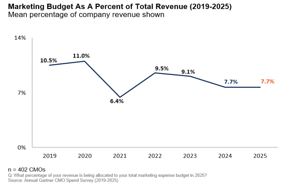 CMOs have slightly reduced martech spending as a share of the total marketing budget, down 0.9% from spring 2024. However, martech usage increased by 1.4% in the same period.