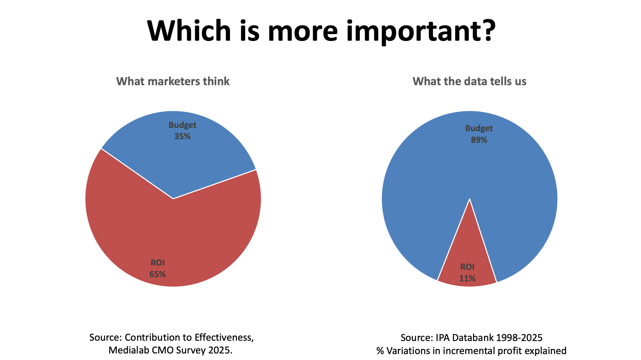 According to a new analysis of the IPA Databank, budget is eight times more important than ROI when it comes to driving effectiveness. When looking at how variations in profit were generated in IPA Effectiveness Award-winning case studies, ROI only accounts for 11% of the variations in payback observed, compared to 89% for budget.