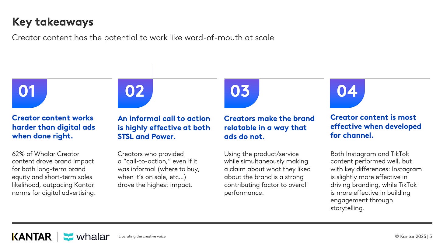 First, we got useful data from Kantar and Whalar at Cannes showing creators generate more impact than digital advertising. Their report highlights the importance of CTAs and on-screen text to enhance creative effectiveness.
