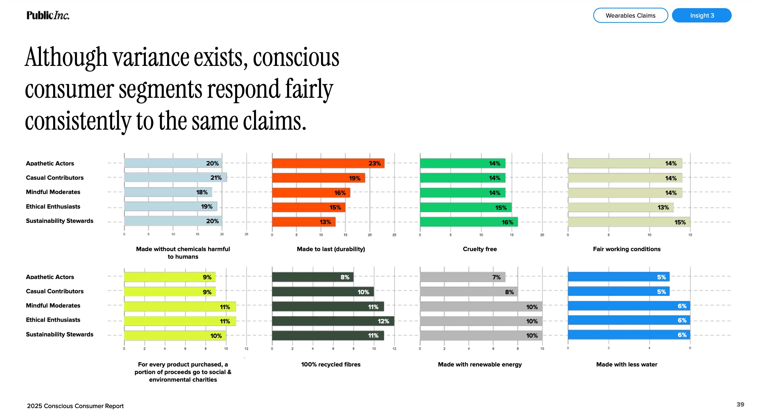 The hardcore conscious consumers are open to more claims. But if you confuse them you lose them. 49% of all consumers have walked away from products with confusing sustainability claims. The number skyrockets to 87% amongst the most conscious consumers.