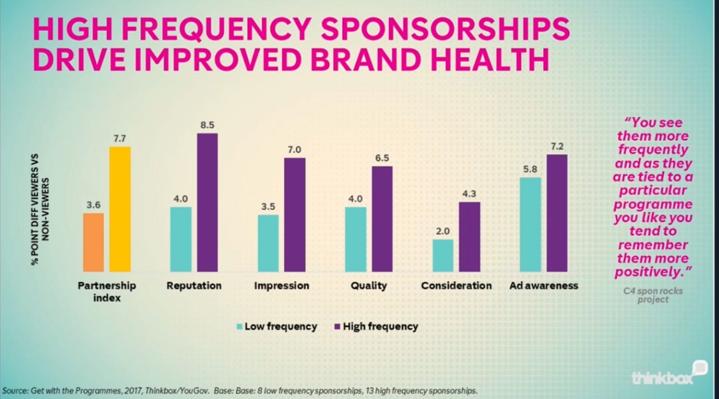 The screenshot above is taken Channel 4’s Sponsorship Rocks Presentation, but the data comes from Thinkbox’s research. Both are worth reading to plan your next programme sponsorship. Channel 4 also shared new data from their research about sponsorships