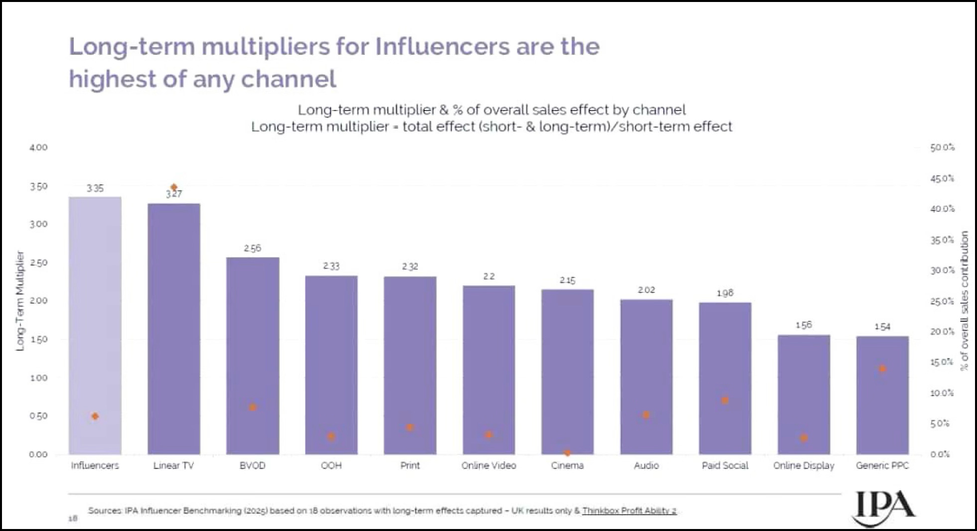 Second, we have a new study from the IPA that reveals, for every £1 (or $1) of short-term sales generated, influencer marketing creates an additional £2.35 in long-term sales impact, a total of £3.35 overall.
