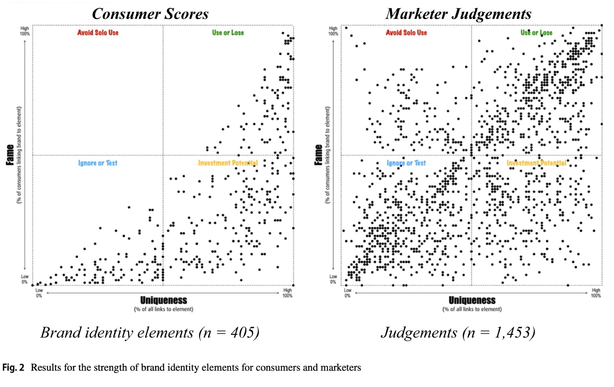 Ehrenberg-Bass Institute reveals marketers misjudge branding elements that bring fame vs recognition. Only 44% of marketers ranked branding elements in the same quadrant as consumers.